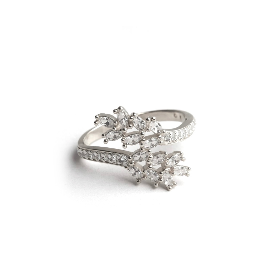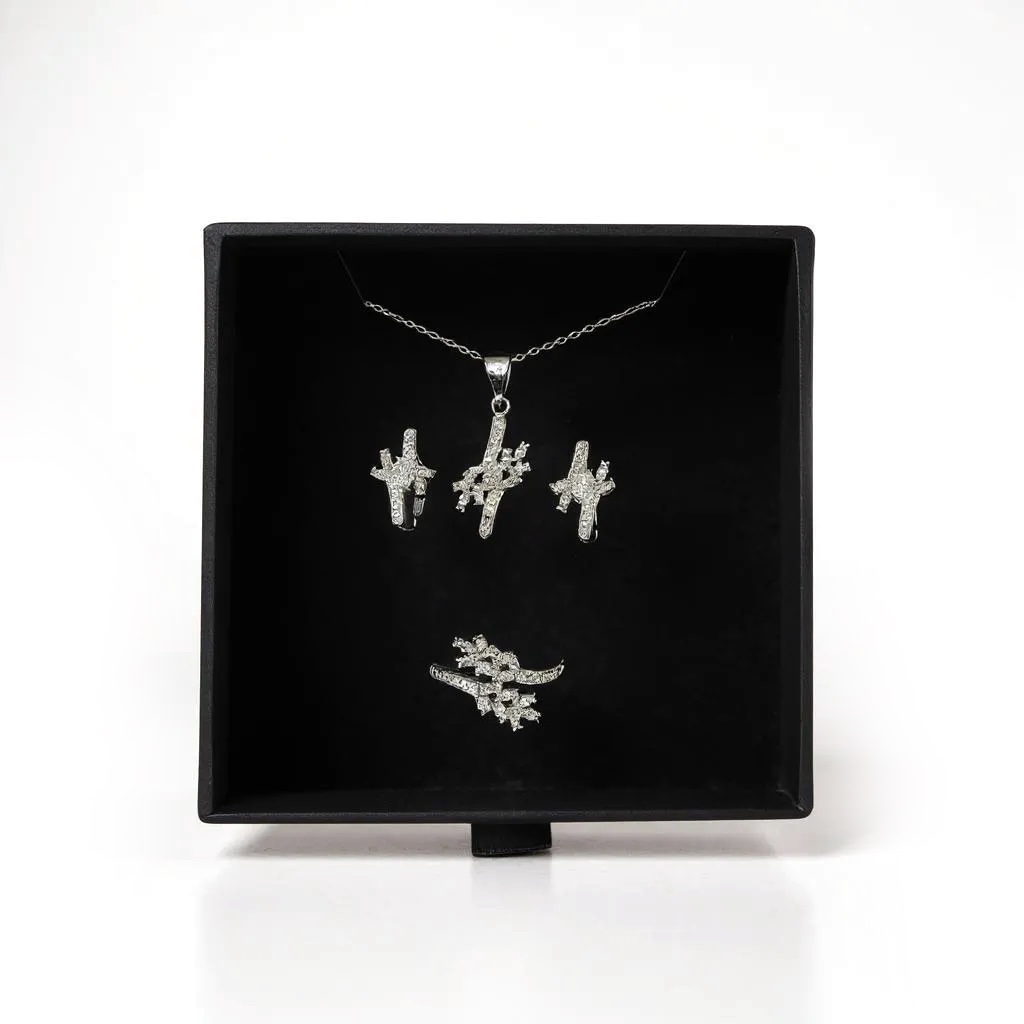 This distinctive trio includes a necklace, earrings, and a ring, all featuring a sculptural design of intertwining silver shapes, studded with clear zircon stones. The result is a visual dance of form and light, bold yet balanced, abstract yet refined.